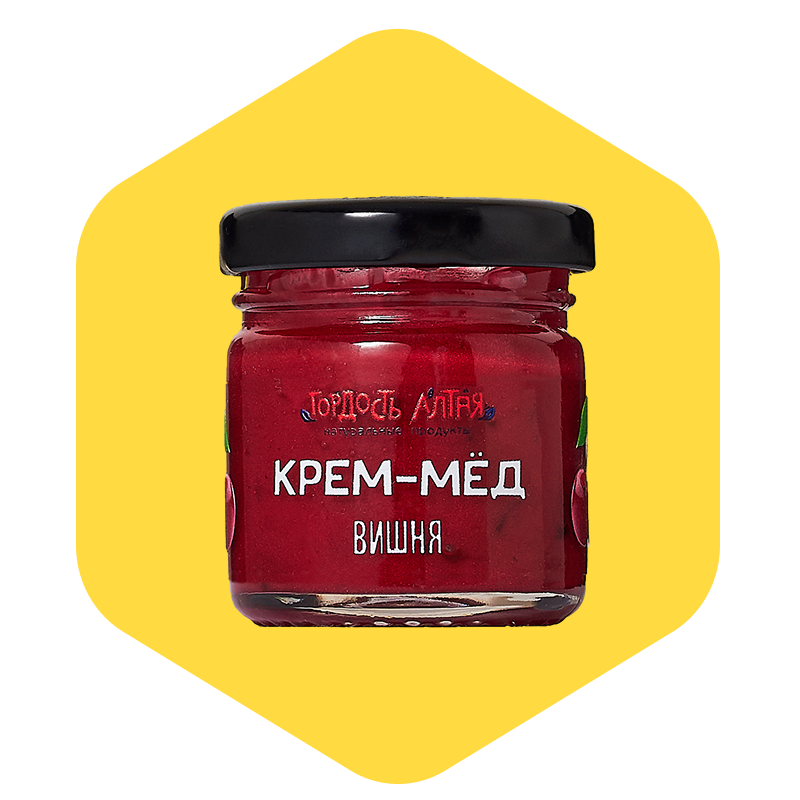 Состав: Крем-мёд (взбитый цветочный мёд из Алтая), вишня (лиофилизат, кусочки или пюре) Состав может уточняться в зависимости от формы добавки.
